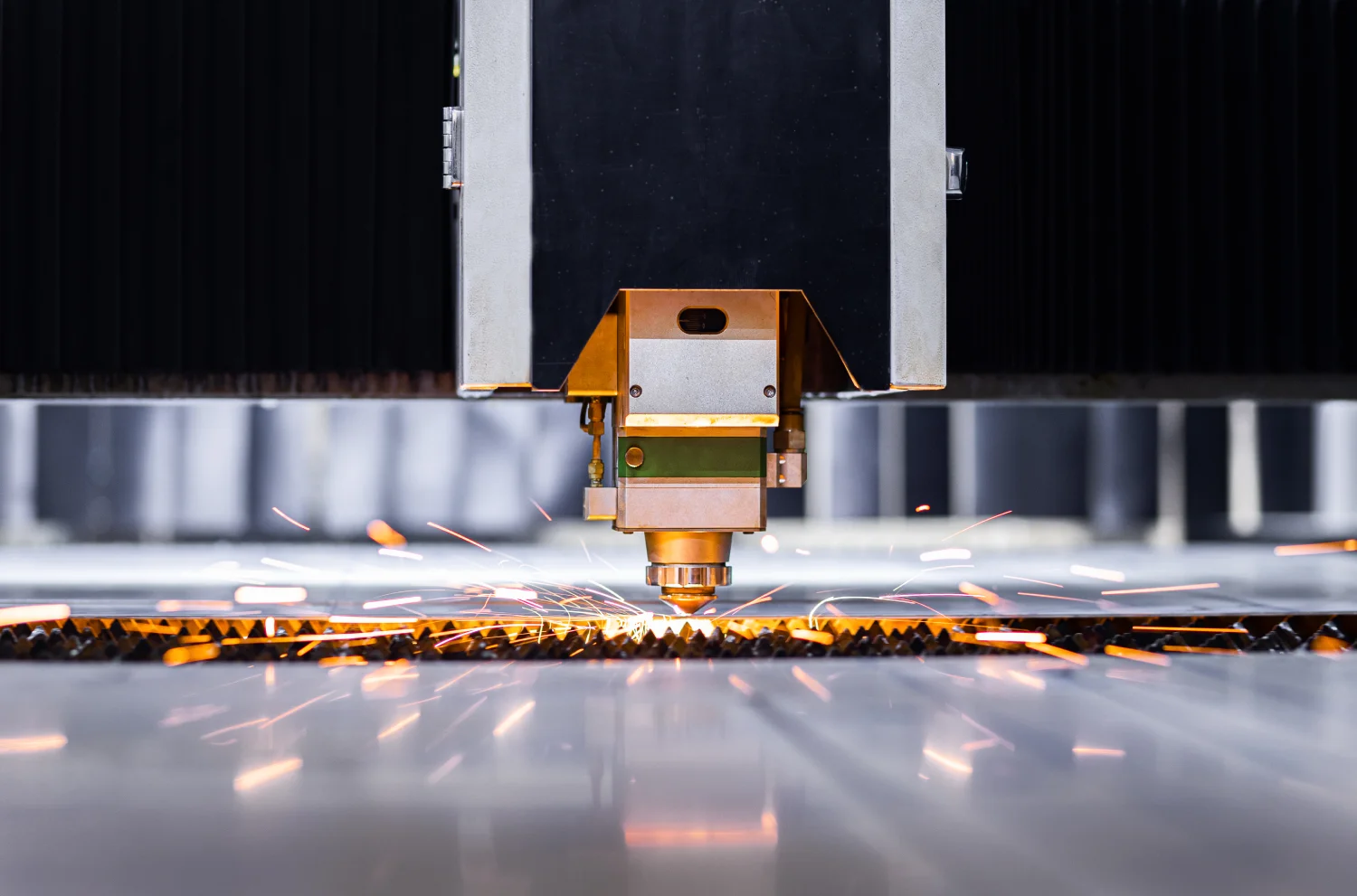 Pemotongan logam menggunakan mesin laser presisi tinggi (CNC) untuk hasil akurat dan rapi.